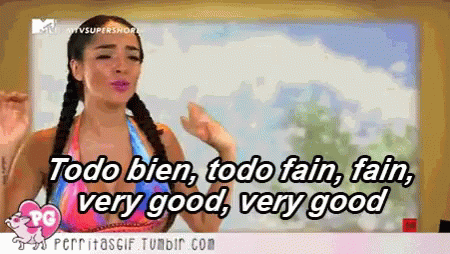 Manelyk from Super Shore in a bikini, cheerfully saying 'Todo bien, todo fain, fain, very good, very good'.