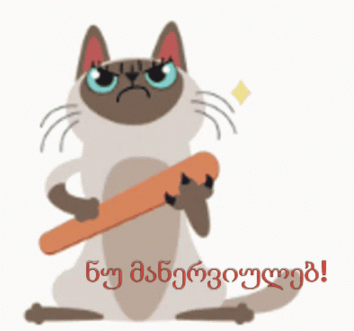 An angry Siamese cat illustration holds a wooden stick, with Georgian text 'Don't make me nervous!' below.