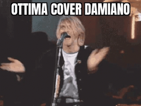 Kurt Cobain of Nirvana performs 'Smells Like Teen Spirit' on stage, with a humorous caption comparing it to a 'great cover' by Damiano of Maneskin.