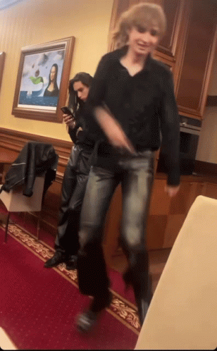 Maneskin Thomas shows off energetic dance moves in a room with a Mona Lisa painting in the background.