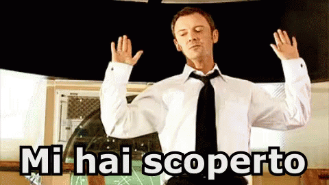 A man in a white shirt and black tie raises his hands in surrender, exclaiming 'You caught me' in Italian.