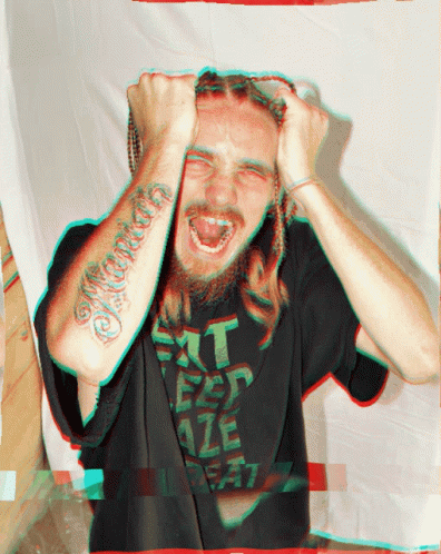 Maniak Max with a 'human' tattoo on his arm, screaming with hands on head, featuring a glitch effect.