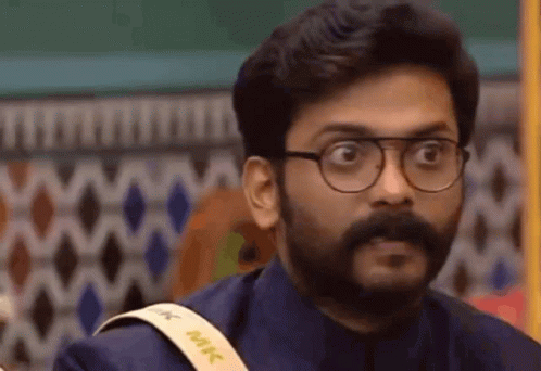 Manikuttan from Bigg Boss Malayalam with a surprised expression, wearing glasses and a beard.
