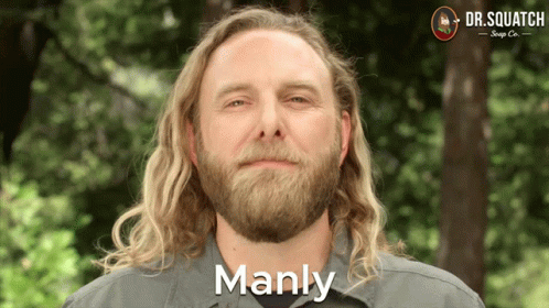 A man with long blonde hair and a beard smiles and says 'manly', embodying masculine traits.