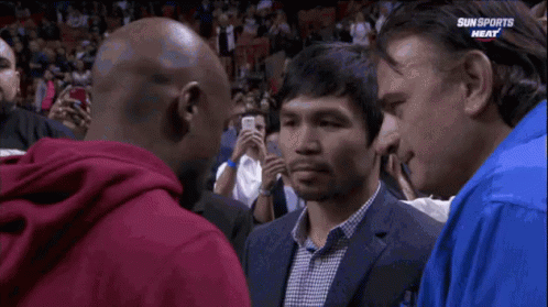 Manny Pacquiao and Floyd Mayweather Jr. meet face-to-face at a basketball game, with a scoreboard showing Milwaukee vs Miami.