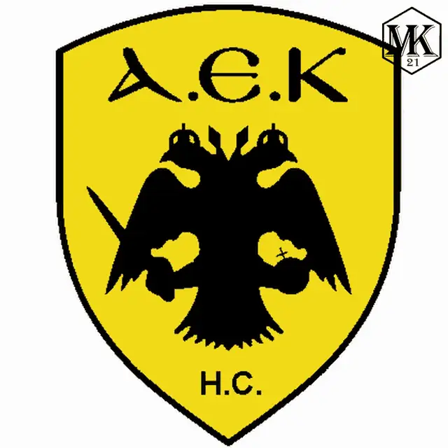 Petros Mantalos of AEK, wearing number 20, proudly lifts the championship trophy in a stadium.