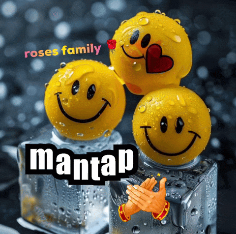 Three smiling emoji faces on ice cubes with 'roses family' and 'mantap' text, accompanied by clapping hands.