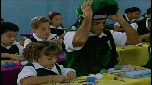 Eugenio Derbez as Ludovico from La Familia P. Luche doing crafts with children in a classroom.