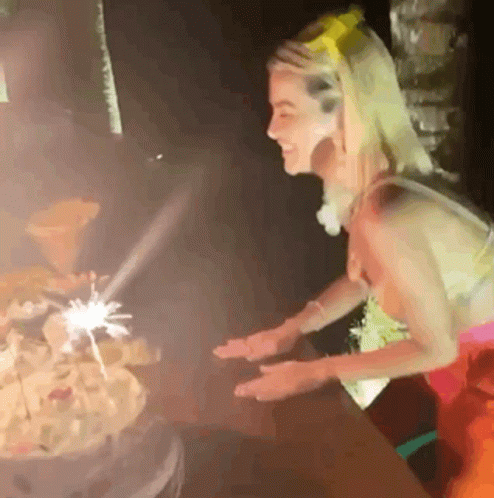 Manu Gavassi celebrates with a cake topped with sparklers, clapping and smiling at an outdoor night party.