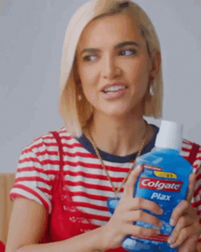 Manugavassi, a woman with blonde hair, holds a bottle of Colgate Plax mouthwash and speaks to the camera.