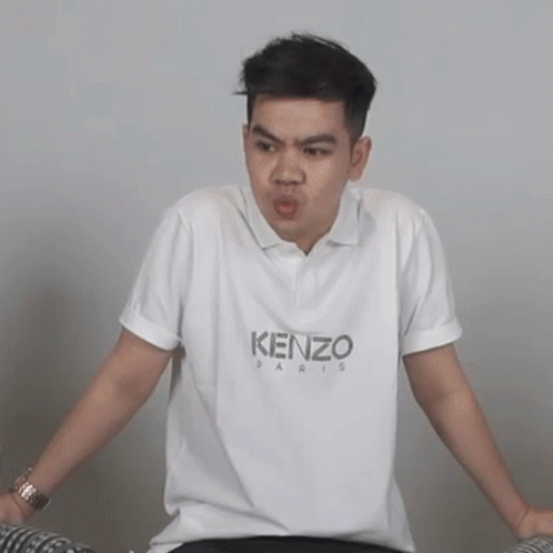 Manyun Faul, a young man in a white Kenzo Paris polo shirt, makes a funny, confused pouting face.