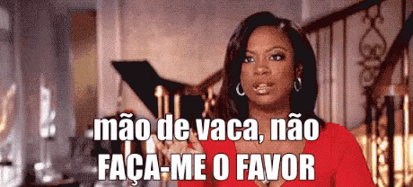 A woman reacts with annoyance to someone being stingy, saying 'Mão de vaca, não, faça-me o favor'.