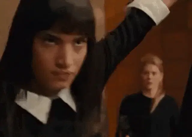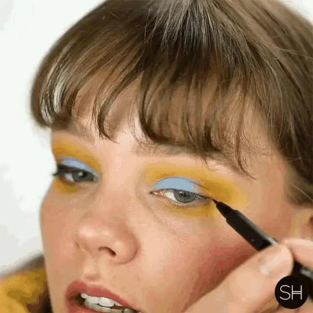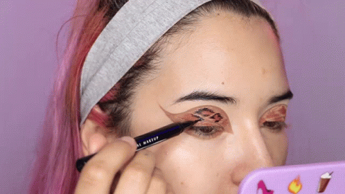 Laura Sanchez applies intricate, patterned eye makeup using an eyeliner pen, looking into a phone mirror.