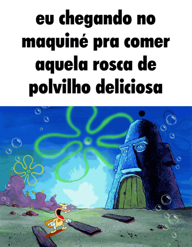 Cartoon of a Spongebob-like house with Portuguese text about arriving at Maquiné to eat.
