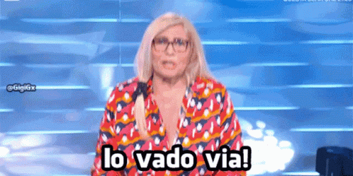 Mara Venier dramatically declares 'Io vado via!' (I'm leaving!) in a television studio setting.