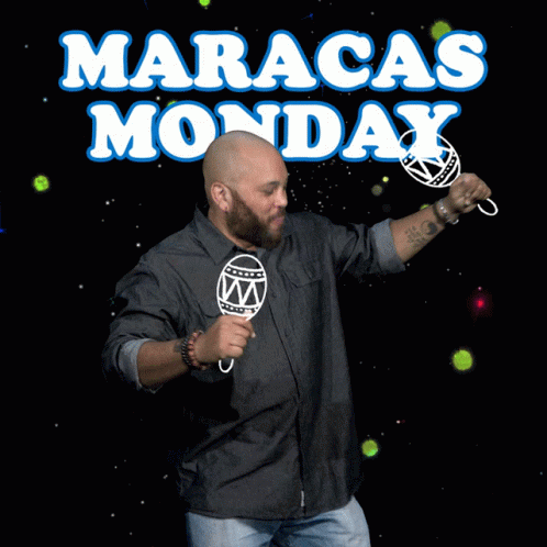 Energetic man dancing with maracas on a sparkling black background, celebrating Maracas Monday.