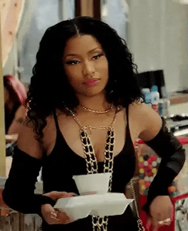 Nicki Minaj from Marajtwt blinking and looking bored with a close-up of her face and black hair.