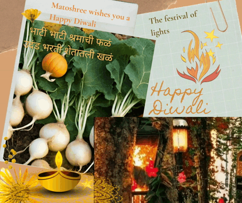 Diwali festival of lights and harvest wishes in Marathi, featuring traditional imagery and a Marathi proverb.
