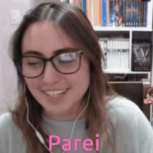 a woman wearing glasses and headphones is smiling with the word parei in pink letters
