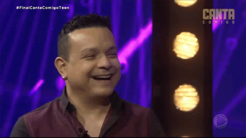 A man on the show Canta Comigo Teen covers his face with his hands, expressing amazement and happiness.
