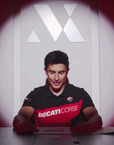 MotoGP rider Marc Marquez winks at the camera while wearing a Ducati Corse polo shirt.