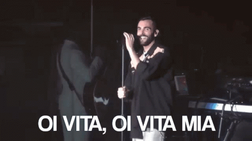 Marco Mengoni performs live, singing the iconic Italian phrase 'Oi Vita, Oi Vita Mia' into a microphone on stage.
