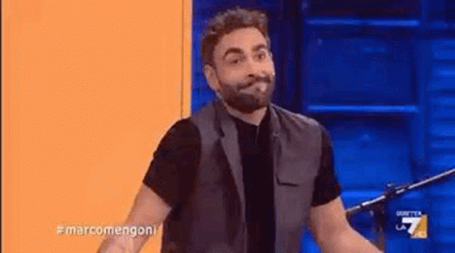 Marco Mengoni smiles expressively on stage, wearing a black shirt and grey vest.