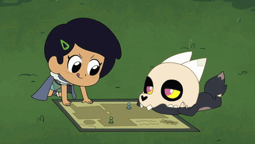 Marcy and King from Amphibia and The Owl House playing a board game, with Marcy using a large green die.