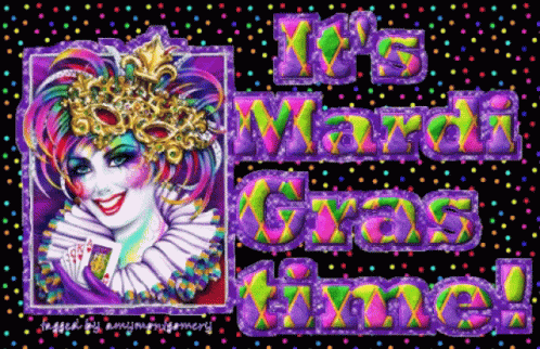 A vibrant Mardi Gras greeting card featuring a woman wearing a festive mask, celebrating Fat Tuesday.