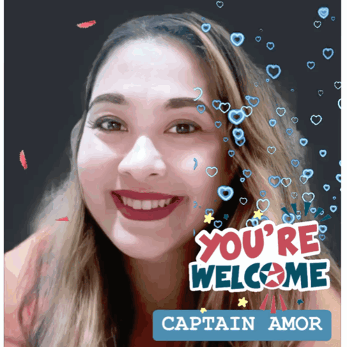 Mardy 1amor smiles at the camera with animated hearts and confetti, displaying a 'You're Welcome' message.