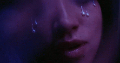 A dramatic close-up of Maria Becerra's face, showing tears running down her cheek under purple light.