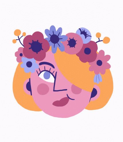 Marie Boiseau, a happy cartoon girl, is depicted with a vibrant flower crown on her head.