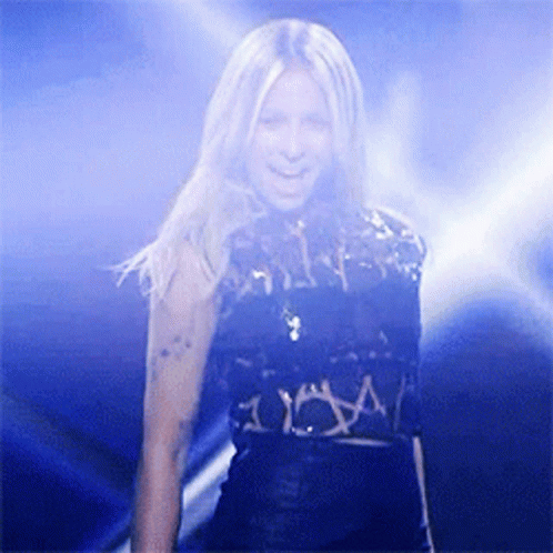 Marie Mai performs on stage, smiling and saluting the audience in a dazzling black sequined top.