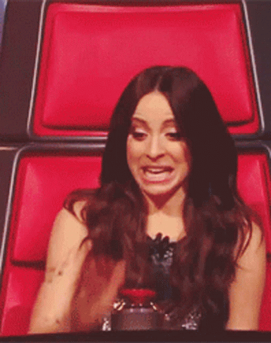 Marie Mai makes an expressive face while pressing a red buzzer button, likely during a moment on The Voice.