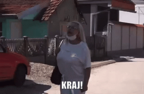 Marija Kulic, wearing glasses and a mask, walks away while declaring 'KRAJ!' (End!) in a street scene.