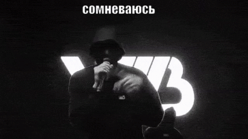Marik Marakesh performing live, singing into a microphone with the Russian caption "I doubt".