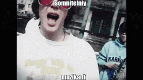 Marik Marakesh in a music video, featuring the Russian text 'somnitelniy muzikant' (doubtful musician).
