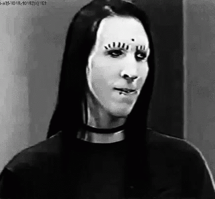 Marilyn Manson looking angry and upset in a black and white clip, featuring his distinctive makeup and choker.