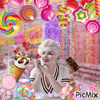 Marilyn Monroe enjoys a sweet fantasy, surrounded by colorful candy, lollipops, and ice cream in a vibrant candy store.