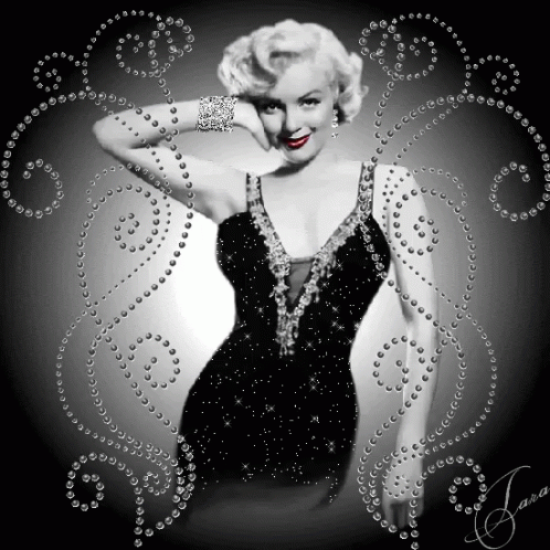 Marilyn Monroe in a black dress, surrounded by sparkling glitter and elegant swirls.