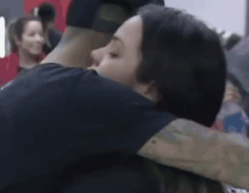 Mari Matarazzo and Matheus Yurley share a warm embrace, showing affection in a public setting.