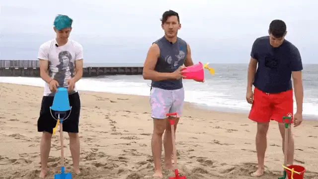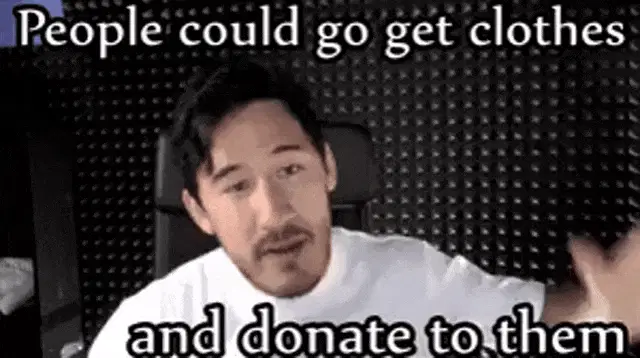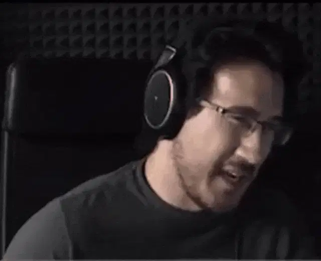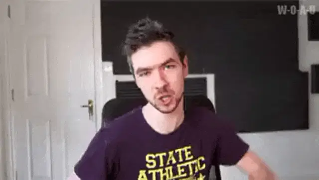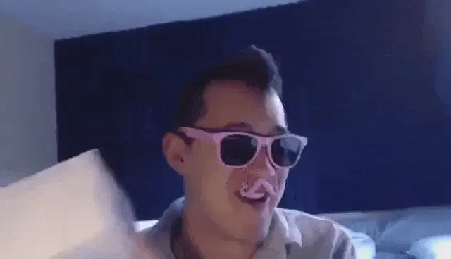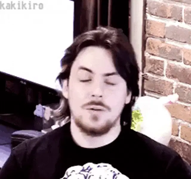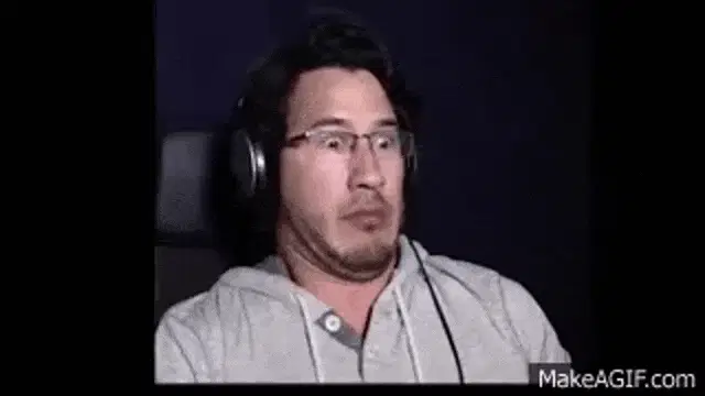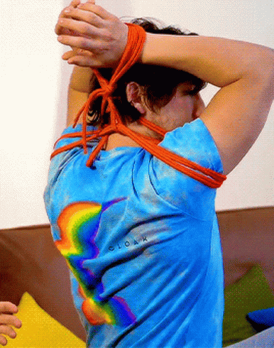 Markiplier with his arms tied above his head with orange rope, wearing a blue Unus Annus shirt.