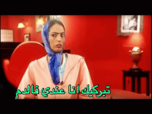 A Moroccan woman in a blue headscarf humorously declares 'Gossip, I have it in my blood' in a comedic skit.