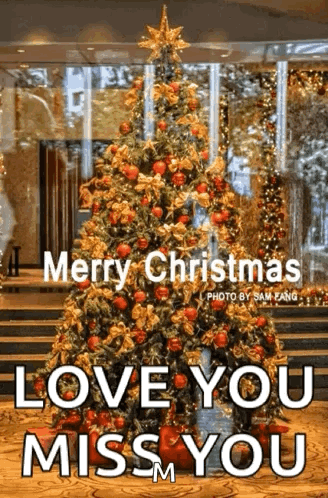 A festive Christmas tree adorned with red and gold ornaments, featuring a heartfelt 'Merry Christmas Love You Miss You' message.