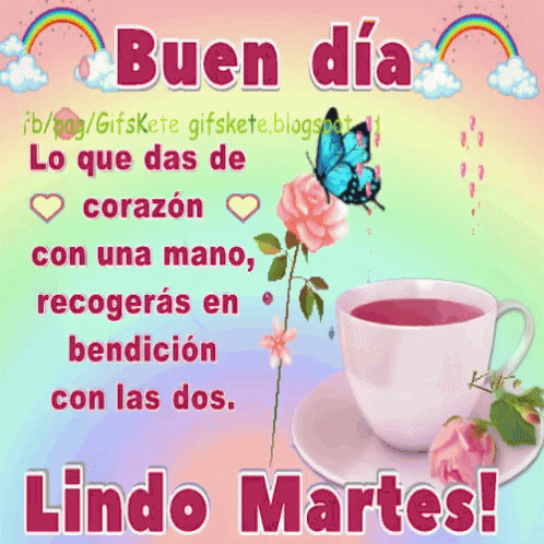 A vibrant image wishing 'Good day' and 'Happy Tuesday!' with an inspiring quote about giving from the heart, featuring a butterfly, roses, and a cup of tea.