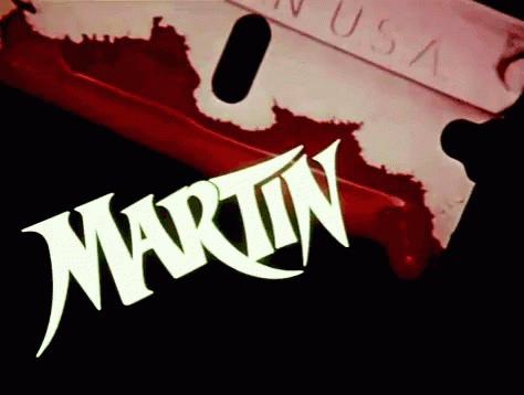 The iconic title card for George A. Romero's 1977 horror film, Martin, featuring blood and a razor blade.