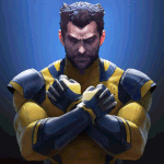 Wolverine from Marvel Future Fight stands with his arms crossed, claws retracted, ready for action.