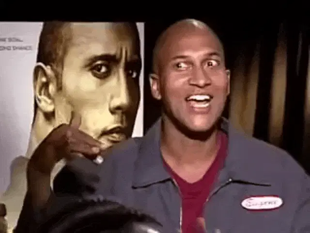 Marvintikvah from MadTV, wearing sunglasses and a blue jacket, calls out 'Hey Shelly, come on out.'