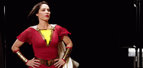 Mary Marvel strikes a powerful pose, showcasing her iconic red and gold Shazam costume with a flowing white cape.