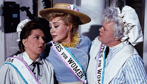 Julie Andrews as Mary Poppins with two other women, all wearing 'Votes for Women' sashes in a historical scene.